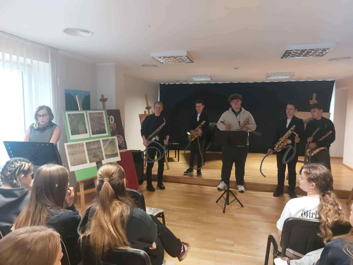 Muzikos istorijos mokytoja Danguolė Gudžiuvienė pristatė M. K. Čiurlionio kūrybos palikimą, atskleidė menininko unikalumą matyti garsus ir girdėti spalvas. Mokiniai smalsiai tyrinėjo kūrėjo paveikslus, juose slypinčius simbolius, metaforas, autoriaus siunčiamas žinutes. Renginyje gyvai skambėjo M. K. Čiurlionio kūriniai fortepijonui, atliekami Paulinos Šolytės ir Ugnės Morkutės (mokyt. Akvilė Baliukonytė).
