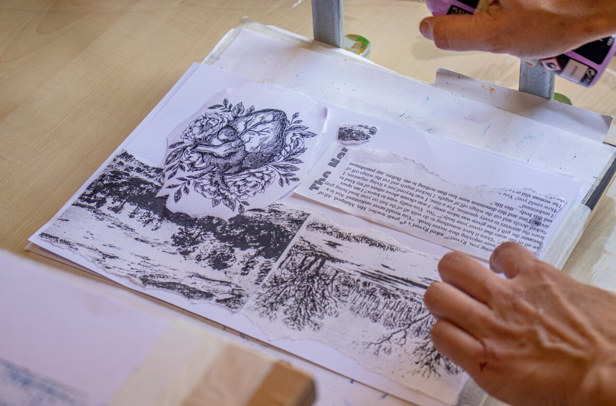 Dalyviai kūrė autorinius kūrinius, naudodami fotografijas, piešinius ir tekstus koliažo principu.