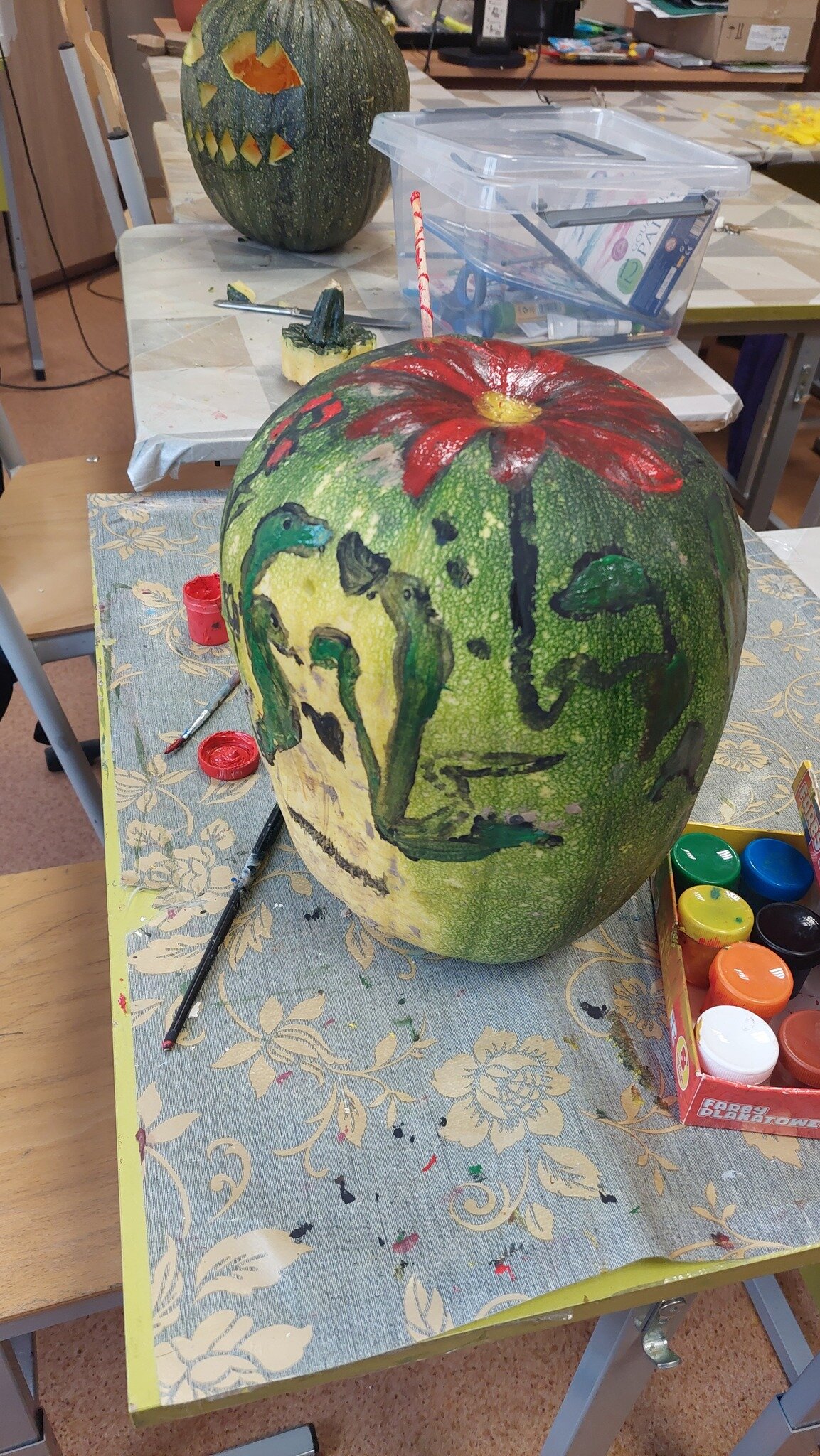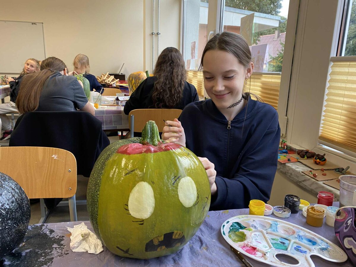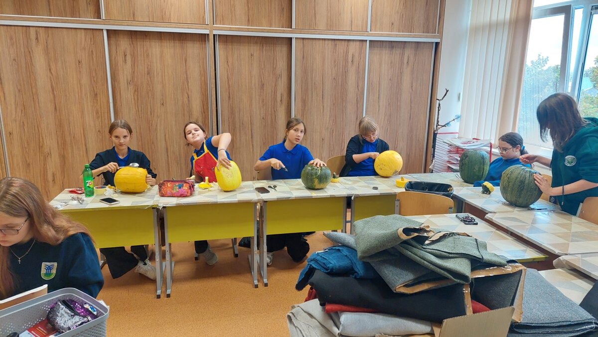 Meno mokyklos dailės klasių mokiniai parodė, kaip nuo mažos moliūgo sėklos išgaunamos užaugusio moliūgo įvairios „skulptūros".