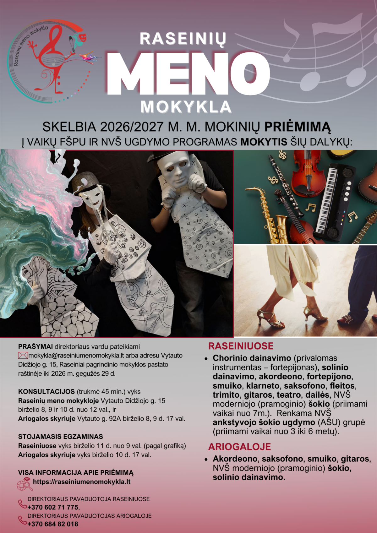 Prašymai direktoriaus vardu teikiami iki 2026 m. gegužės 29 d. el. paštu mokykla@raseiniumenomokykla.lt arba pagrindinio mokyklos pastato raštinėje (Vytauto Didžiojo g. 15).