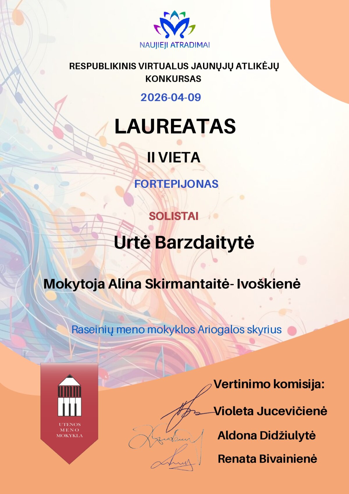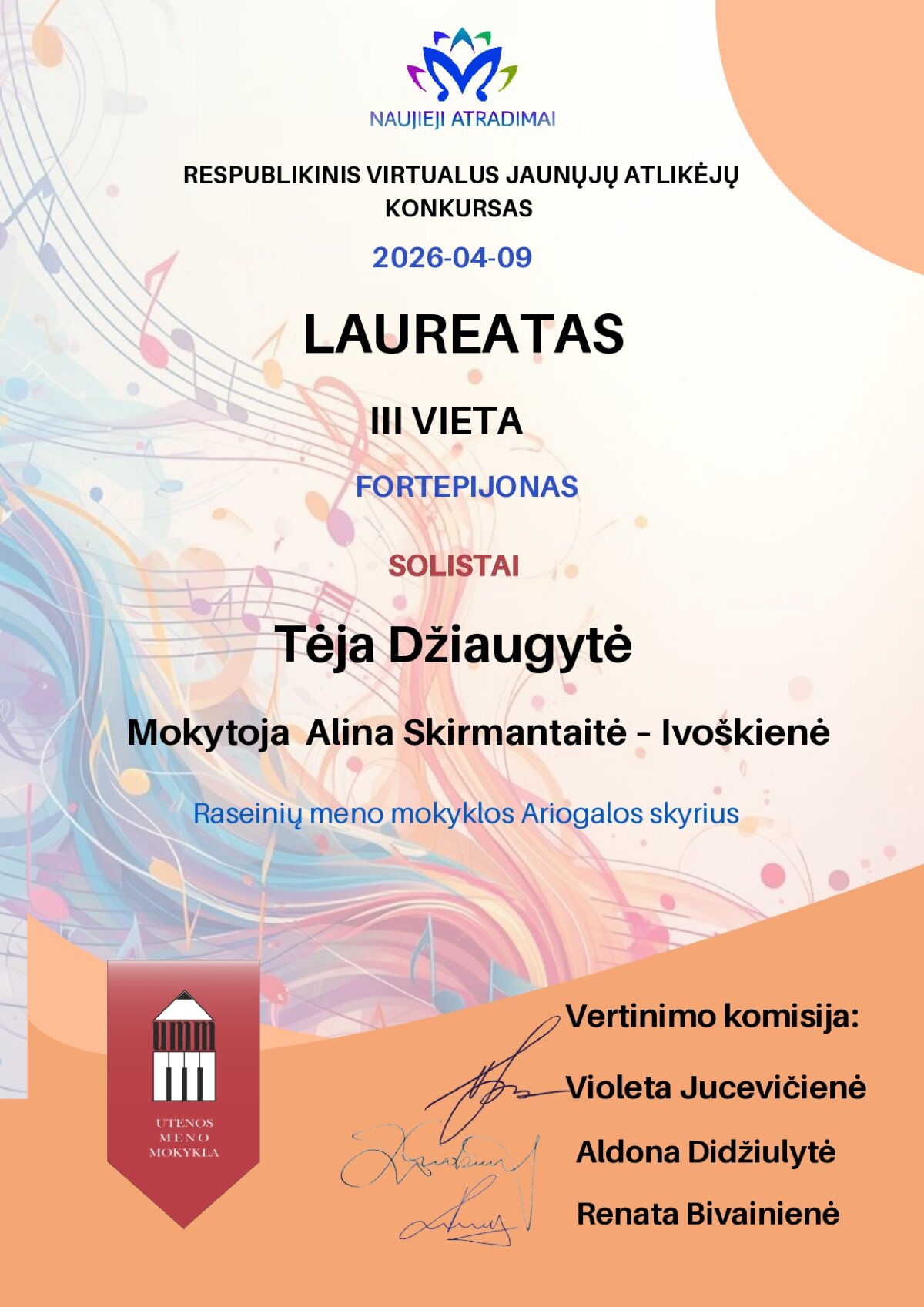 Sveikiname Raseinių meno mokyklos Ariogalos skyriaus pianistus, sėkmingai dalyvavusius respublikiniame virtualiame jaunųjų atlikėjų konkurse „Naujieji atradimai 2026“!