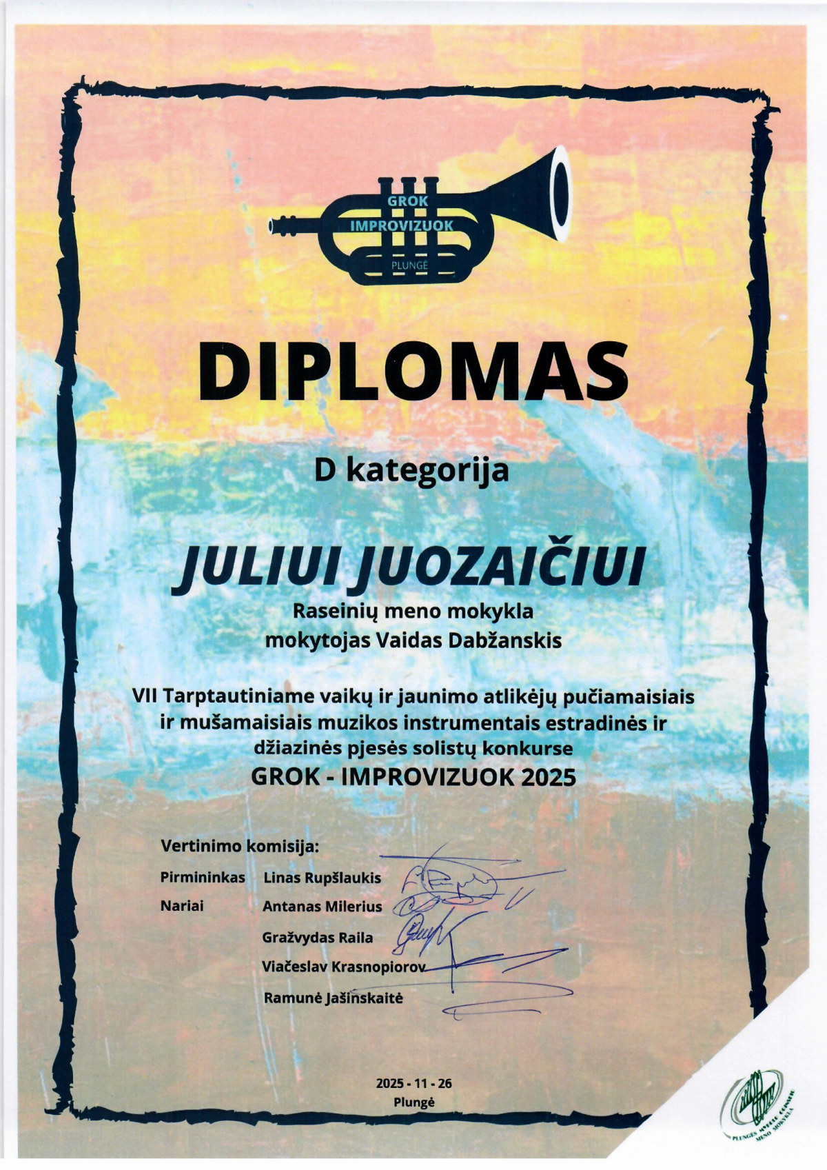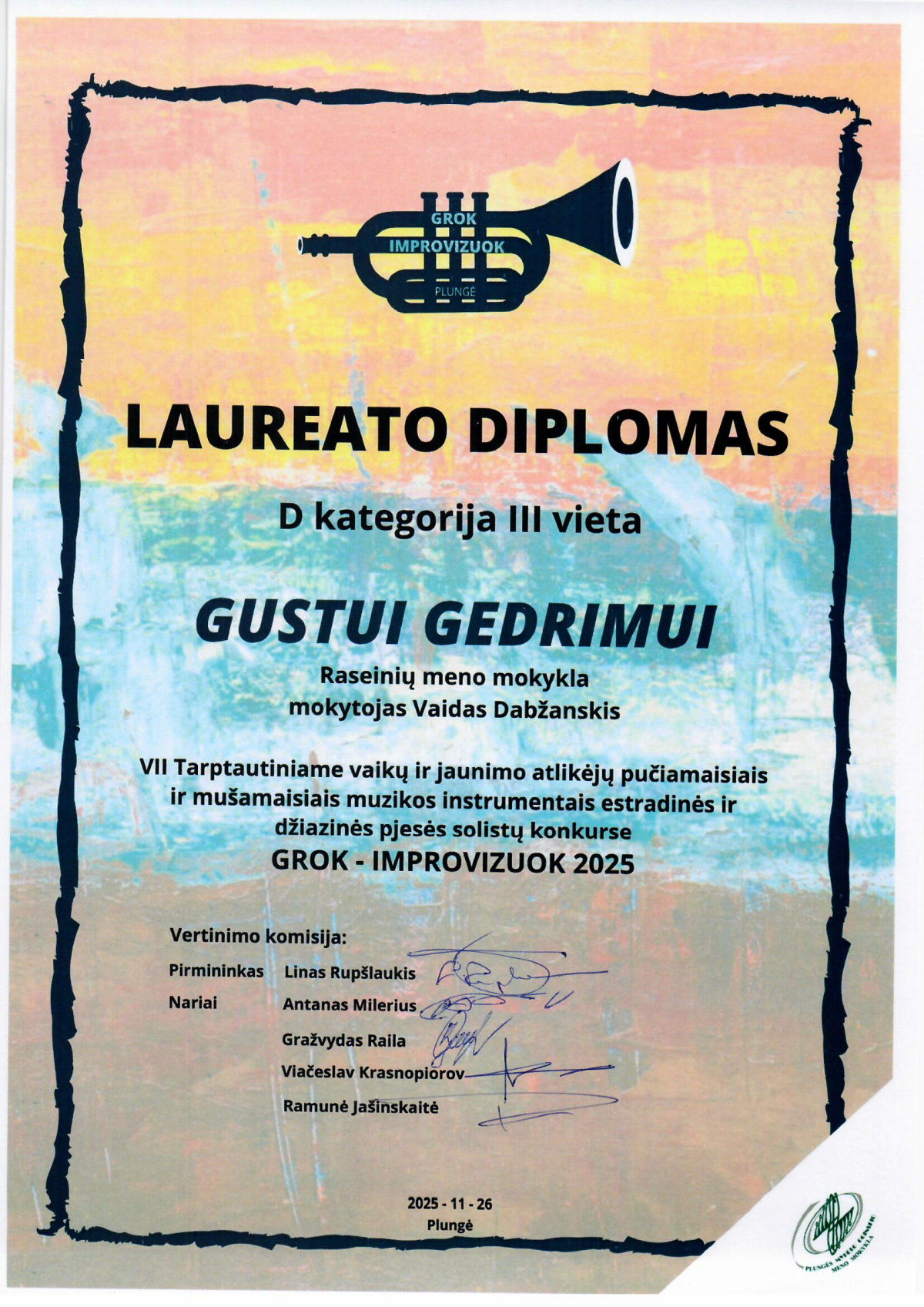 Lapkričio 26 d. Plungės Mykolo Oginskio meno mokykloje vyko VII tarptautinis vaikų ir jaunimo atlikėjų pučiamaisiais ir mušamaisiais muzikos instrumentų estradinės ir džiazinės pjesės solistų konkursas „Grok – improvizuok 2025“ Konkurse varžėsi 82 atlikėjai iš Latvijos, Ukrainos, Norvegijos bei Lietuvos miestų ir miestelių. Raseinių meno mokyklą atstovavo ir prizines vietas pelnė mokytojos metodininkės Astos Nikžentaitienės mokinė Goda Kybartaitė 2- vietą, koncertmeisterė Daiva Petkevičiūtė, vyr. mokytojo Vaido Dabžanskio mokiniai: Gustas Gedrimas 3- vietą ir Julius Juozaitis tapo diplomantu.